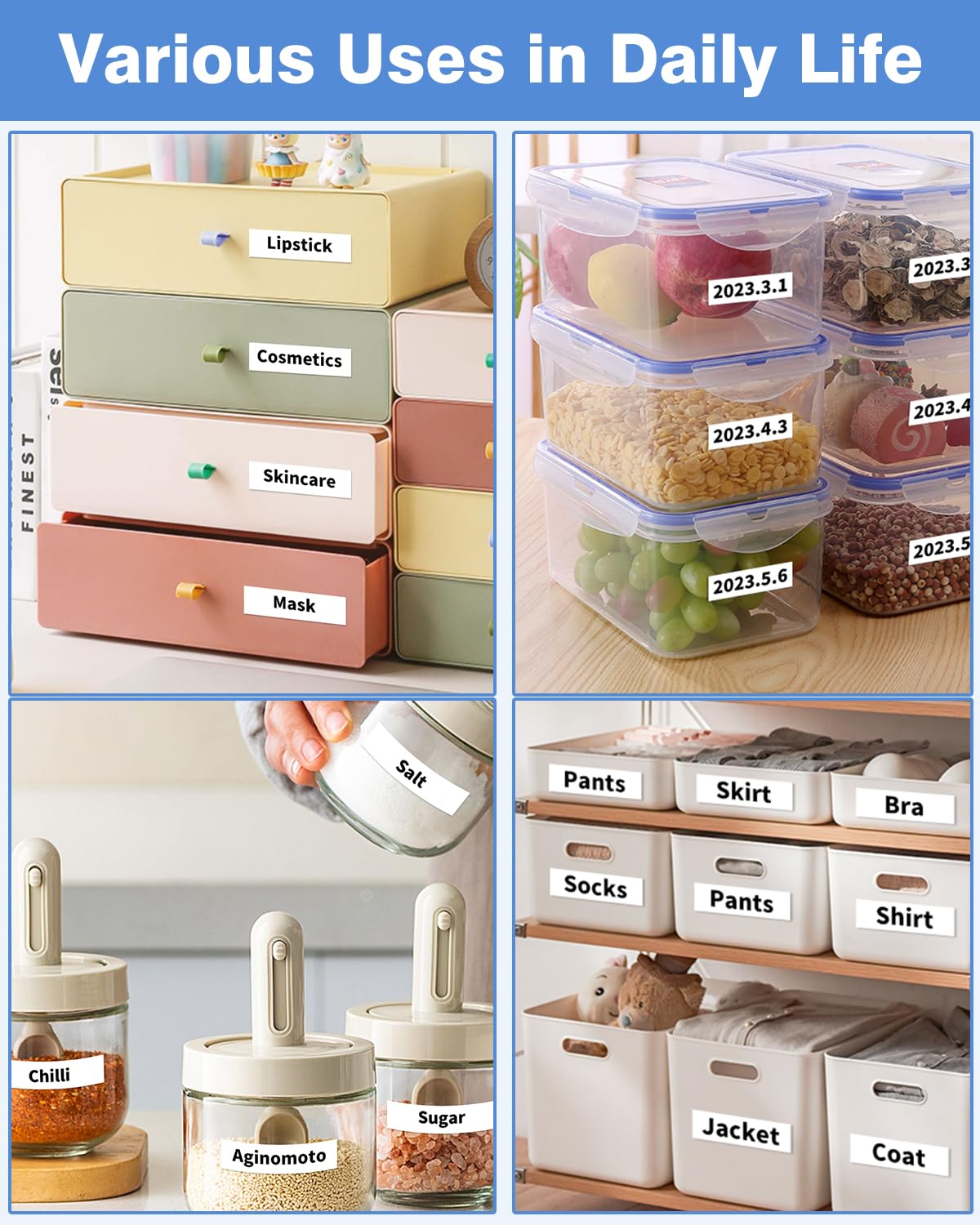 - Ampiamente usato: Con la stampa a trasferimento termico, è facile stampare etichette in nastro chiare e attraenti per organizzare la tua vita. Ad esempio: casa, ufficio, scuola, negozio, fabbrica, ecc.